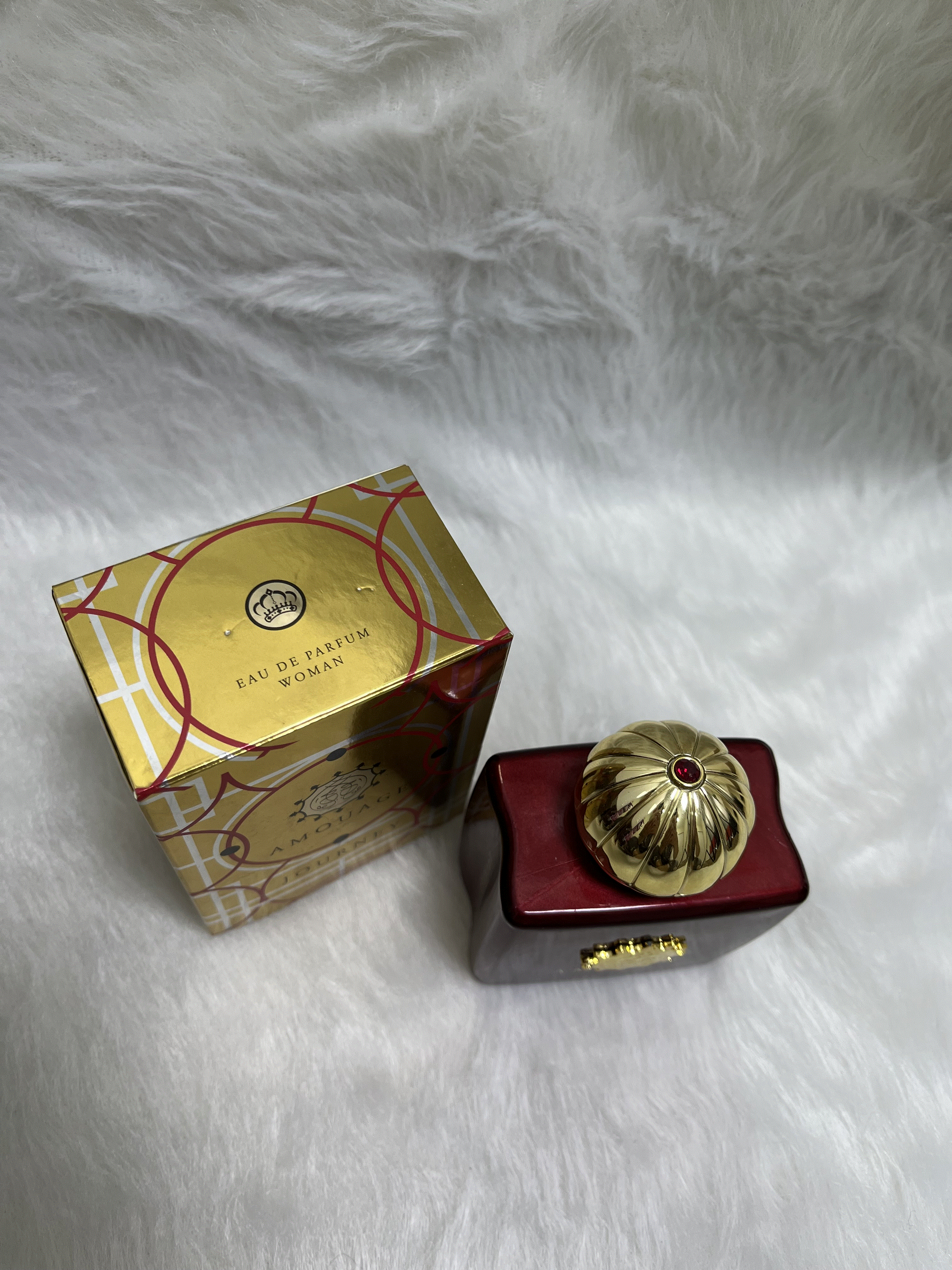 بطری قرمز لاکی با در طلایی – کاملاً سلطنتی و لوکس؛ مثل یه شیء تزئینی خاص روی میز عطر.